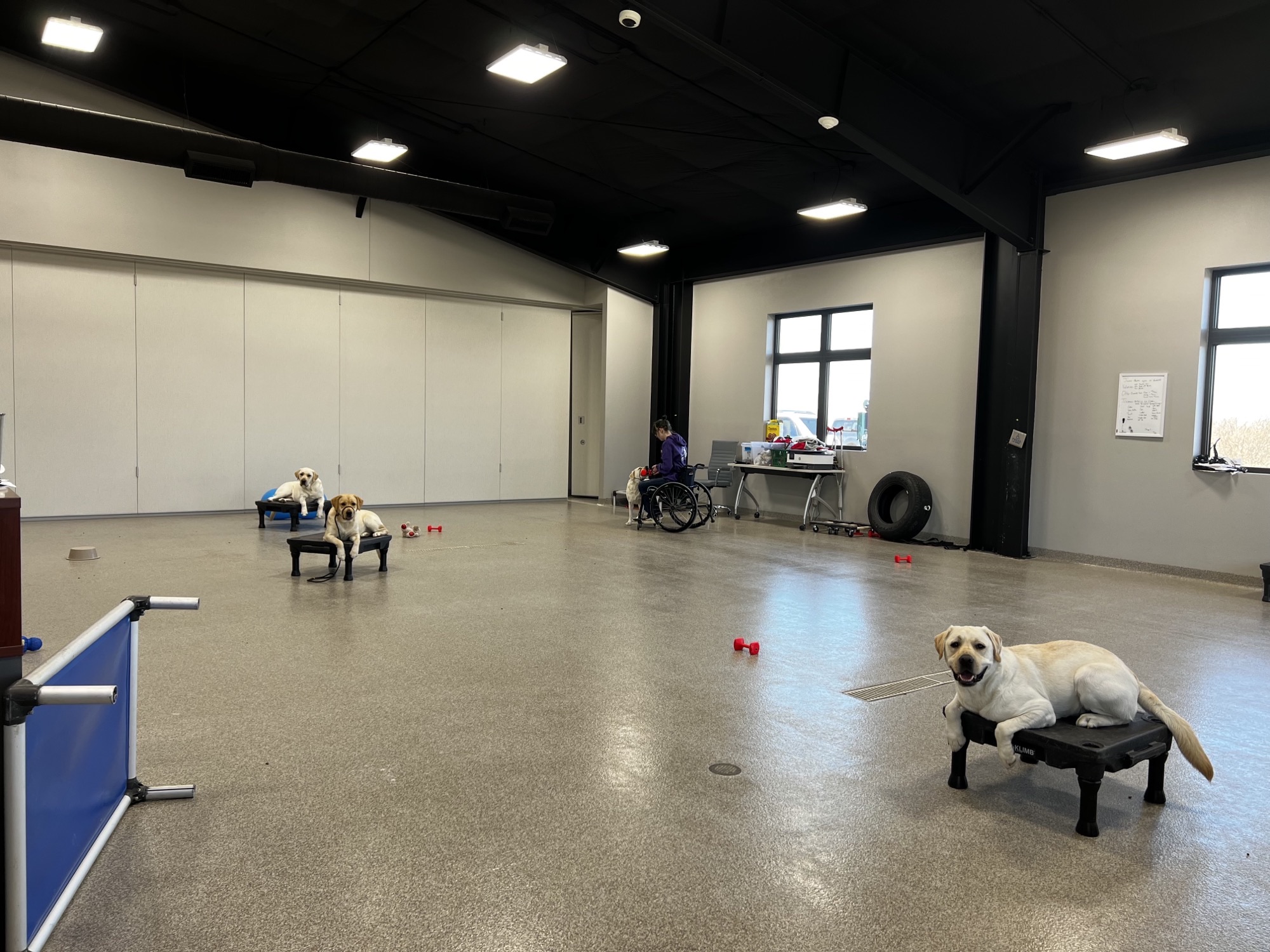 Retrieving Freedom, Inc. (RFI) currently operates out of two state-of-the-art facilities. The first opened in Waverly, Iowa in 2015, and the brand-new headquarters facility opened in Sedalia, Missouri in 2020. Both facilities were designed with our clientele in mind; all areas are handicap-accessible and were created for comfort. When you visit one of our facilities, you will see large training rooms. These rooms are where the professional training staff work numerous dogs each day on specific tasks that will better enhance a client’s life. Next, you will find our housing quarters. The shared living and kitchen spaces are surrounded by three dormitories for clients to utilize when training at our facilities. They have queen sized beds and handicap-accessible bathrooms for clients who are traveling or needing to train overnight with their future service animal. Lastly, our kennel area is where dogs are housed after-hours, as well as a place for them to rest between training sessions.